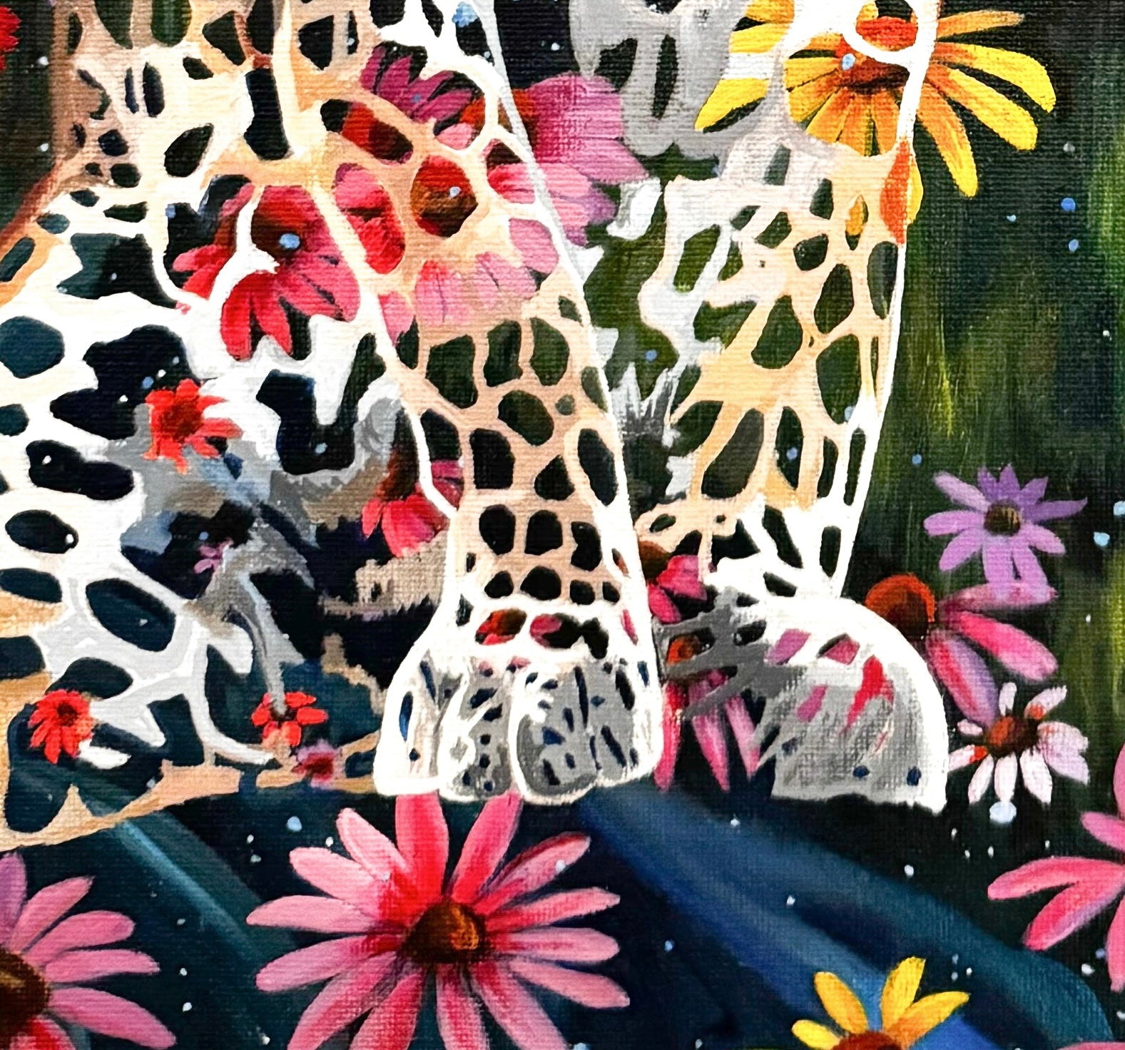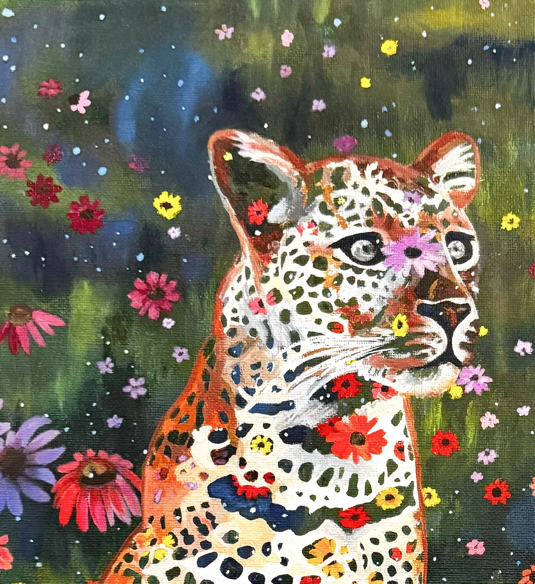 “Dreams and Wishes Volume 2” is a mesmerizing piece that merges the wild elegance of a leopard with the ethereal beauty of a field of flowers infused with the cosmos. In this artwork, the leopard poses gently in a vibrant field of stars and flowers yet its spots are transformed—each one infused with delicate blooms and twinkling stars, blurring the line between creature and universe. This interplay of flora and celestial light within the leopard’s pattern becomes a powerful symbol of dreams and wishes, suggesting that aspirations are as natural and intrinsic as the animal’s own markings.