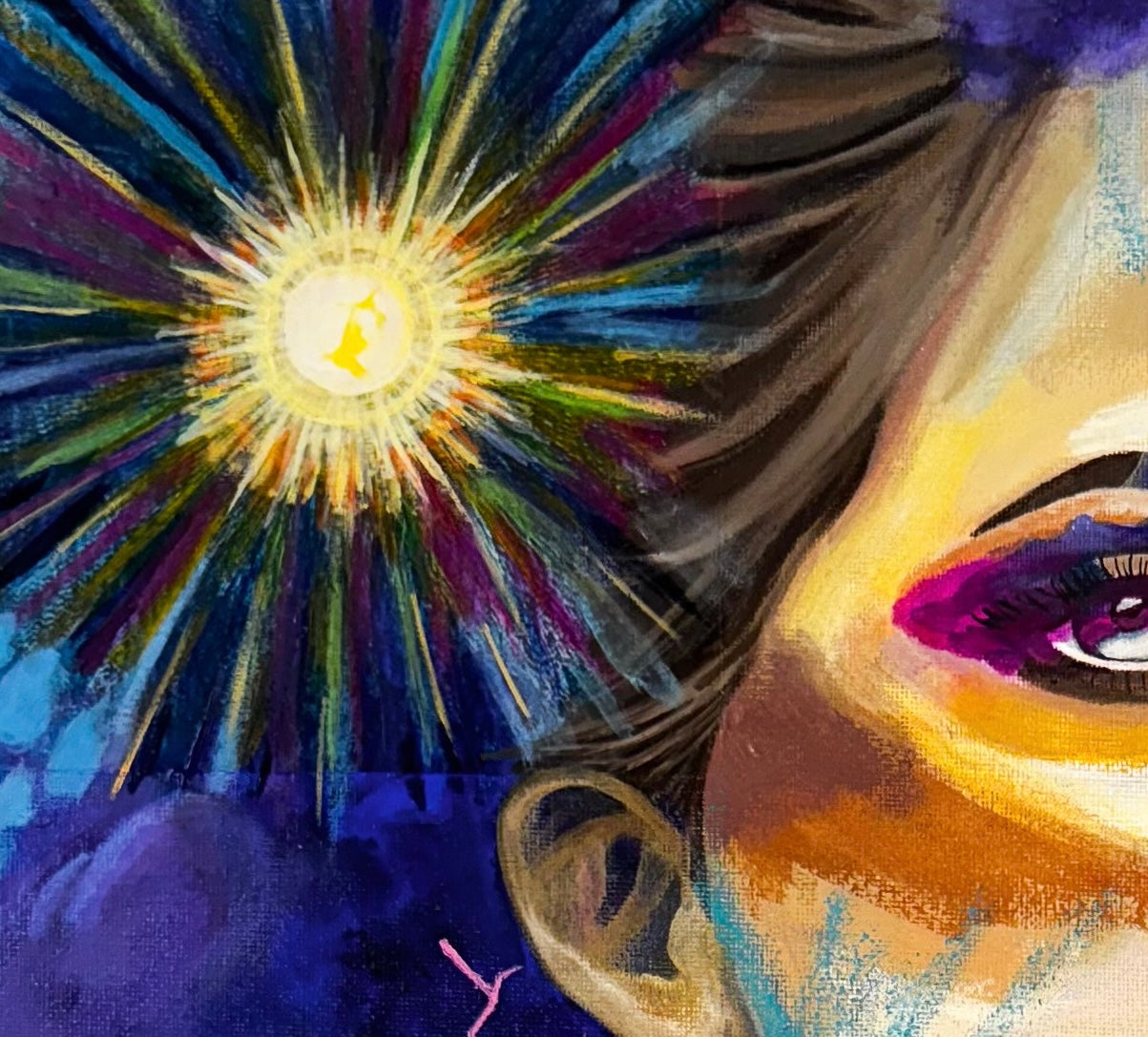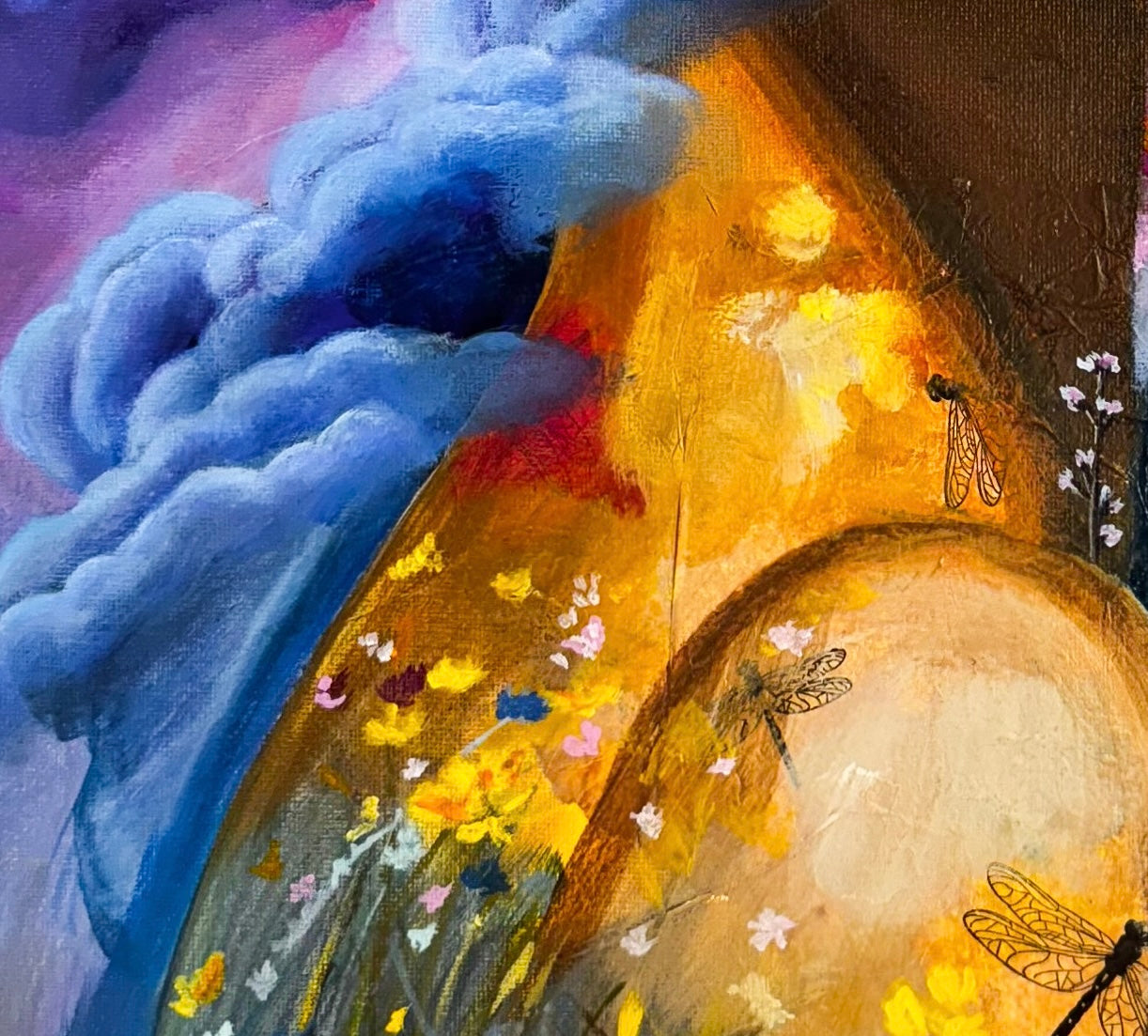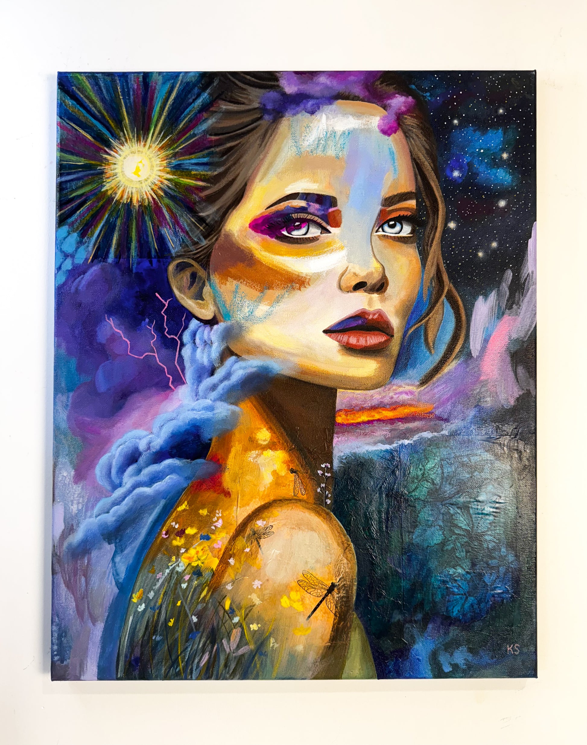 Acrylic and oil on canvas. 16x20 inches. UV filtered varnish for protection against discolouration. Prints also available.