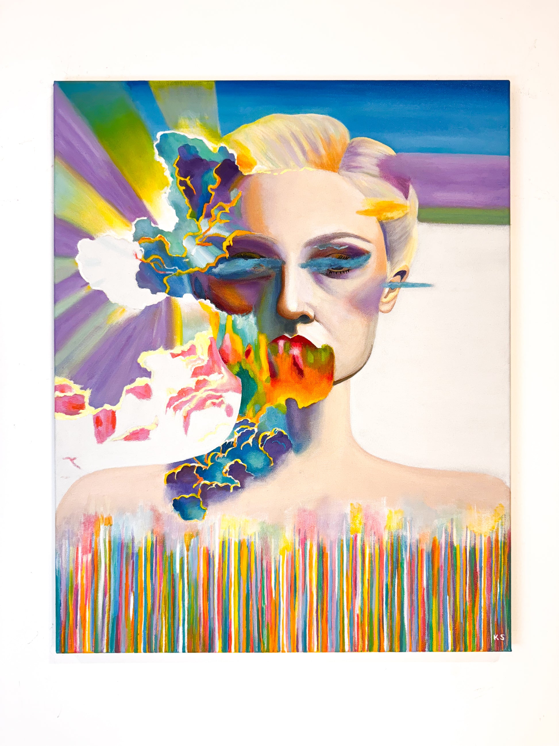 The artwork presents a woman whose gaze is partly hidden behind drifting multicolored clouds, as though her thoughts have materialized into soft, shifting vapors. The clouds swirl in vibrant hues—rose, teal, violet—creating a dreamlike veil. The orange portion of the cloud formation engulfs her mouth like fire blurring the boundary between her body and the atmosphere around her.